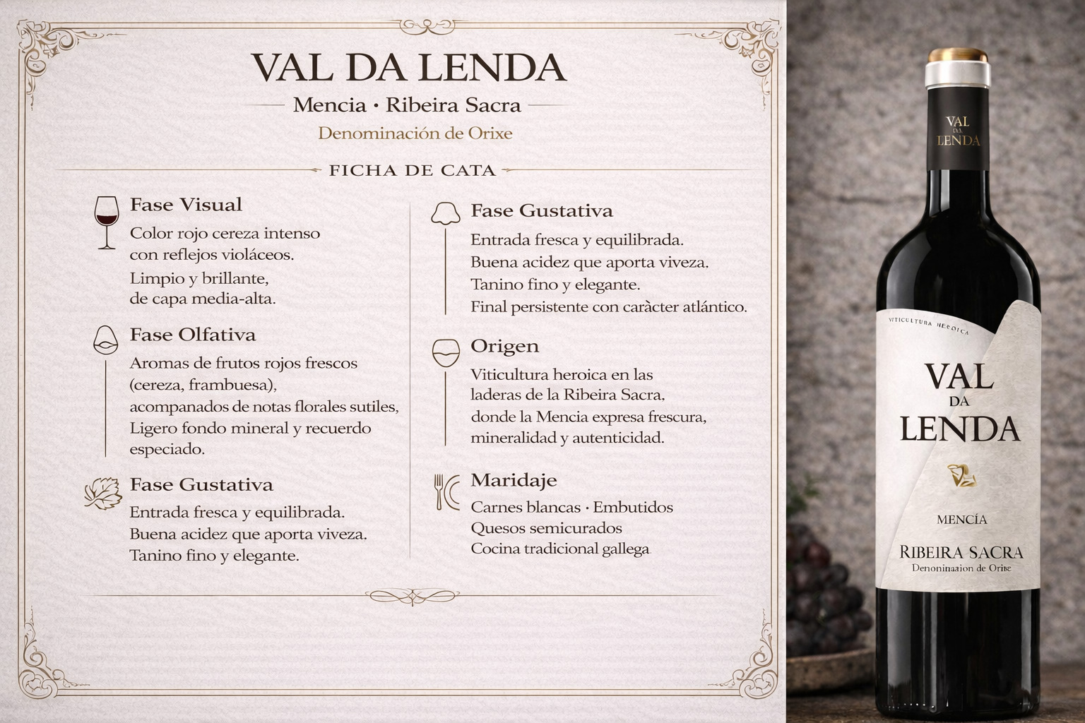 Elaboramos Val da Lenda a partir de uvas de la variedad mencía de nuestros propios viñedos situados en Amandi.