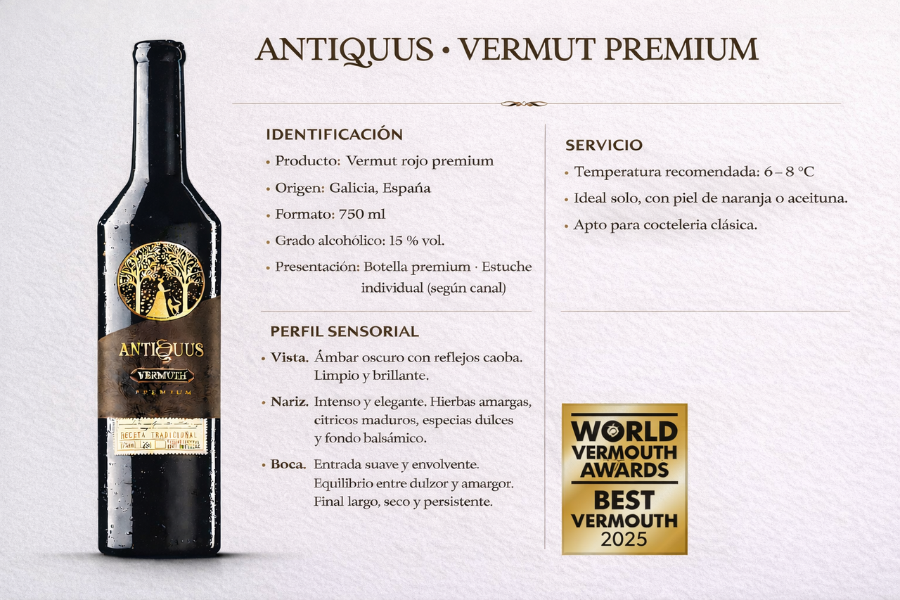 Vermuth artesano para aperitivo y postre, con notas vegetales, cítricas, canela y caramelo.