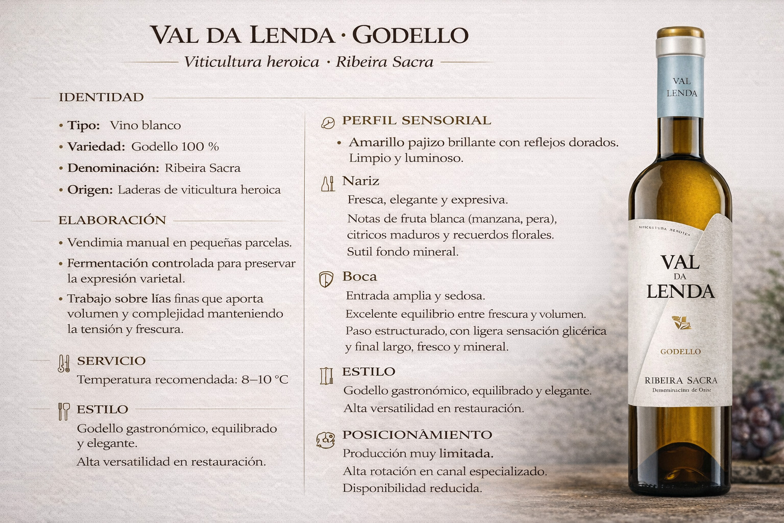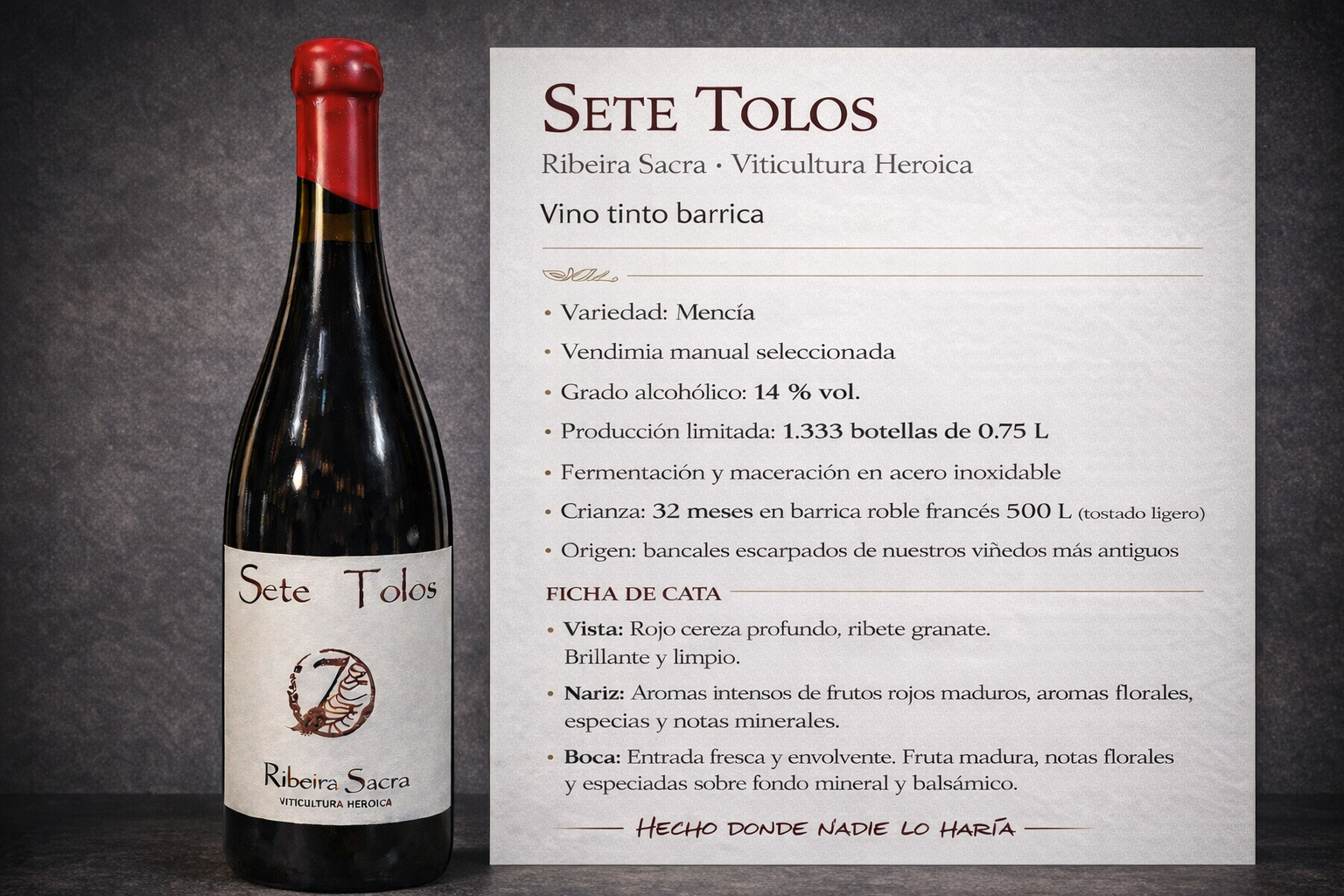 Variedad: Mecía 100% Bodega: Víctor Manuel Rodríguez. D.O. Ribeira Sacra, subzona Amandi Suelo: Esquisto, cultivo en viñedos abancalados con pendientes que llegan a un 80% de inclinación, orientación sur, microclima mediterráneo con influencia atlántica pluviometría anual media 700 mm. Tª media 14ºC. Insolación anual media: 2000 horas. Edad de los viñedos: 25/80 años. Poda: en vaso t espaldera. Vendimia: En cajas de 20 Kg, los racimos de la variedad son vendimiados a…